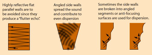 Sound is more pleasing if it is evenly dispersed, with no prominent echoes, no significant "dead spots" or "live spots" in the auditorium. This even dispersion is usually achieved by avoiding any focusing surfaces and avoiding large flat areas which reflect sound into the listing area. Sometimes it is desirable to add some anti-focusing surfaces.