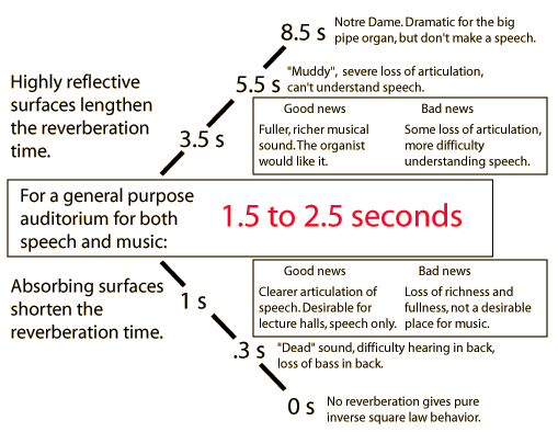 Good projection of sound to the rear of the enclosure. Desirable acoustic properties of the auditorium can be contributed by its architecture. The desired properties at left are correlated with the measurable parameters at right. Long enough reverberation time.