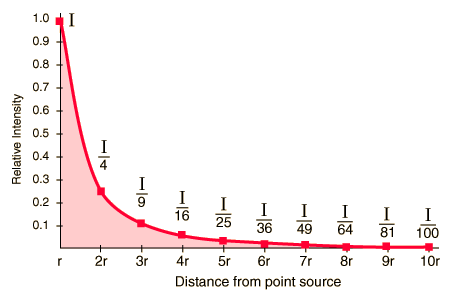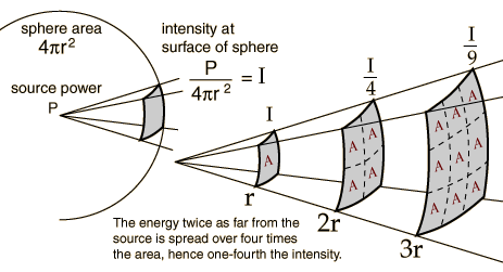 Inverse Square Law, SoundThe sound intensity from a point source of sound will obey the inverse square law if there are no reflections or reverberation. A plot of this intensity drop shows that it drops off rapidly. ![]()