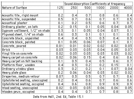 Sound Absorption CoefficientWhen a sound wave in a room strikes a surface, a certain fraction of it is absorbed, and a certain amount is transmitted into the surface. Both of these amounts are lost from the room, and the fractional loss is characterized by an absorption coefficient a which can take values between 0 and 1, 1 being a perfect absorber. Effective absorbing area = aS The effective absorbing area is a factor in determining the reverberation time of an auditorium. The absorption coefficient of a surface typically changes with frequency, so the reverberation time is likewise frequency dependent. A table of absorption coefficients can be used in calculations of reverberation time with the Sabine formula.