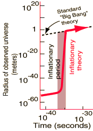 Triggered by the symmetry breaking that separates off the strong force, models suggest an extraordinary inflationary phase in the era 10-36 seconds to 10-32 seconds. More expansion is presumed to have occurred in this instant than in the entire period ( 14 billion years?) since.