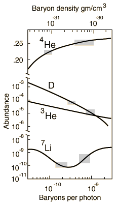 Big Bang Nucleosynthesis![]() The modeling of the early universe by the standard big bang model gives a scenario that involves twelve nuclear interactions that led to the present cosmic abundances of elements outside the stars. The vast majority of the mass of ordinary matter in the universe is hydrogen and helium, remaining from the early stages of the universe. The illustration above gives nominal abundances of the current constituents. These abundances are model dependent and subject to revision. Beryllium-7 is an isotope that is produced in this process, but is not a part of the cosmic abundances because it is radioactive with half-life 53.28 days, decaying to 7Li. Neutrons are not part of the background elements because free neutrons decay with half-life 10.3 minutes. The other constituent of the reactions is tritium, 3H, which has a half-life of 12.32 years.