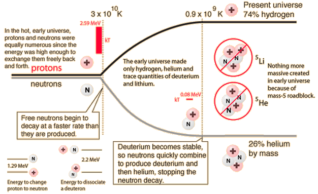Hydrogen-Helium AbundanceHydrogen and helium account for nearly all the nuclear matter in today's universe. This is consistent with the standard or "big bang" model. The process of forming the hydrogen and helium and other trace constituents is often called "big bang nucleosynthesis". Schramm's figures for relative abundances indicate that helium is about 25% by mass and hydrogen about 73% with all other elements constituting less than 2%. Carroll & Ostlie give 23 to 24% helium. There is a window of uncertainty, but it is clear that hydrogen and helium make up 98% plus of the ordinary matter in the universe. This high percentage of helium argues strongly for the big bang model, since other models gave very small percentages of helium. Since there is no known process which significantly changes this H/He ratio, it is taken to be the ratio which existed at the time when the deuteron became stable in the expansion of the universe. This ratio is significant as a test of cosmological models since it will be affected by the time period from the time when the temperature dropped below that necessary to produce neutrons from protons to the time when the deuteron became stable, halting the decay of the free neutrons. ![]() Basically , the hydrogen-helium abundance helps us to model the expansion rate of the early universe. If it had been faster, there would be more neutrons and more helium. If it had been slower, more of the free neutrons would have decayed before the deuterium stability point and there would be less helium. ![]()