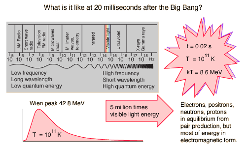 Electromagnetic radiation and the flux of neutrinos were the dominant form of energy in the early universe, becoming more dominant as one models earlier times in the big bang. It is reminiscent of the Biblical phrase "Let there be light". But of course this is not visible light but far beyond gamma rays since the average photon energy increases as one models earlier times and photon energies become high enough to accomplish pair production of all known particles. For example at a temperature of 1011 K, modeled at a time of about 20 milliseconds into Weinberg's model of the big bang, the thermal energy kT = 8.6 MeV. At this temperature, the peak energy given by the Wien displacement law is 42.8 MeV. The radiation energy was sufficient not only for electron-positron pair production, but also to maintain essentially equal populations of protons and neutrons. So in that era, radiation was truly dominant.