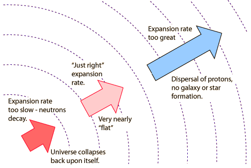 ![]() The evidence that the universe is expanding came originally from Hubble and we now characterize it with the Hubble constant and Hubble's law. This evidence helped form the big bang model of the universe along with the 3K background radiation and the hydrogen-helium abundance. But what determines the expansion rate? It appears to have been determined from the beginning, and the rate of expansion is quite critical to the construction of the universe we see. If the expansion rate were too fast, then matter would not have been able to clump into galaxies and stars. If it were too slow, then it would remain at a high temperature for a longer time period and we could have lost all the neutrons since they spontaneously decay unless they are trapped in and atomic nucleus. The mass of the universe comes into the picture here as helping determine the expansion rate. If the mass were too large, then the expansion would slow down, stop, and then collapse backward toward the center. The evidence we now have suggests that the mass of the universe is very close to the "critical mass" so that it will continue to expand indefinitely.