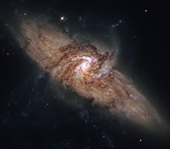 "This new image from NASA's Hubble Space Telescope and its Wide Field and Planetary Camera 2 (WFPC2) shows the unique galaxy pair called NGC 3314. Through an extraordinary chance alignment, a face-on spiral galaxy lies precisely in front of another larger spiral. This line-up provides us with the rare chance to visualize dark material within the front galaxy, seen only because it is silhouetted against the object behind it. Dust lying in the spiral arms of the foreground galaxy stands out where it absorbs light from the more distant galaxy. This silhouetting shows us where the interstellar dust clouds are located, and how much light they absorb. The outer spiral arms of the front galaxy appear to change from bright to dark, as they are projected first against deep space, and then against the bright background of the other galaxy. NGC 3314 lies about 140 million light-years from Earth, in the direction of the southern hemisphere constellation Hydra. The bright blue stars forming a pinwheel shape near the center of the front galaxy have formed recently from interstellar gas and dust. A small, red patch near the center of the image is the bright nucleus of the background galaxy, NGC 3314b. It is reddened for the same reason the setting sun looks red. When light passes through a volume containing small particles (molecules in the Earth's atmosphere or interstellar dust particles in galaxies), its color becomes redder. The Hubble Heritage color image of NGC 3314 was constructed from archival images taken with WFPC2 in April 1999 by Drs. William Keel and Ray White III (University of Alabama) in blue and infrared light, combined with new images obtained by the Heritage team in March 2000 using blue, green and red filters. " NASA description.