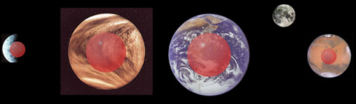 Using data on the structure of the Earth, a simplified perspective can be constructed of the inner planets and Earth's Moon. The size of Earth's core is shown, and the planet densities above are used to construct similar images of the other inner planets. All except the Moon have sizable iron cores. The moons of Mars are too small to show in this perspective.