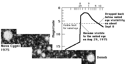 The brightest Nova in recent years was Nova Cygni 1975 which became visible in Cygnus in August. It reached a magnitude of 1.8 after a rise in magnitude of about 15 in two days time. This is a million-fold increase in luminosity!