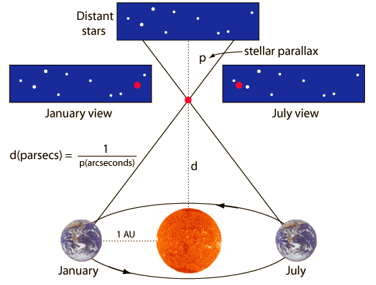 Stellar ParallaxA nearby star's apparent movement against the background of more distant stars as the Earth revolves around the Sun is referred to as stellar parallax.![]() This exaggerated view shows how we can see the movement of nearby stars relative to the background of much more distant stars and use that movement to calculate the distance to the nearby star.