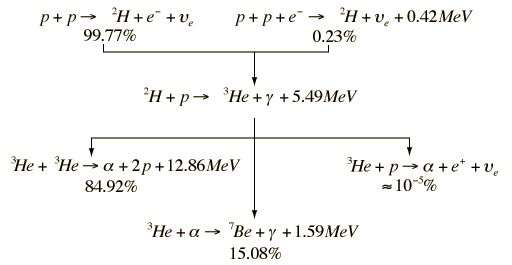 This is the nuclear fusion process which fuels the sun and other stars which have core temperatures less than 15 million Kelvin. A reaction cycle yields about 25 MeV of energy. The modeling of these reactions is a part of the standard solar model.