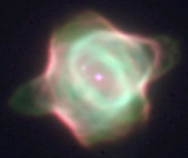 Stingray Nebula![]() "This Wide Field and Planetary Camera 2 image captures the infancy of the Stingray nebula (Hen-1357), the youngest known planetary nebula. In this image, the bright central star is in the middle of the green ring of gas. Its companion star is diagonally above it at 10 o'clock. A spur of gas (green) is forming a faint bridge to the companion star due to gravitational attraction. The image also shows a ring of gas (green) surrounding the central star, with bubbles of gas to the lower left and upper right of the ring. The wind of material propelled by radiation from the hot central star has created enough pressure to blow open holes in the ends of the bubbles, allowing gas to escape. The red curved lines represent bright gas that is heated by a "shock" caused when the central star's wind hits the walls of the bubbles. The nebula is as large as 130 solar systems, but, at its distance of 18,000 light-years, it appears only as big as a dime viewed a mile away. The Stingray is located in the direction of the southern constellation Ara (the Altar). The colors shown are actual colors emitted by nitrogen (red), oxygen (green), and hydrogen (blue). " (NASA description). Photo credit: NASA, Matt Bobrowsky, Orbital Sciences Corporation.
