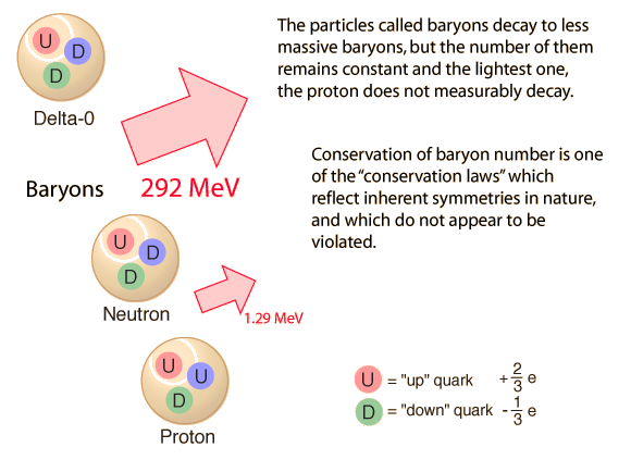 ![]() Just like water running downhill, it is a general observance that particles and systems will move spontaneously from a high energy state to a lower one. For the variety of particles that we have observed in the universe, this principle plays out in the decay of particles. In general, a particle will decay to another particle or particles if in doing so it can lower its energy. In the world of small particle decay, this general tendency is often stated as the "totalitarian principle" which is something like "if it can happen, it will". If a heavy particle seems to have a way to decay into a lighter particle or particles but it is not observed to do so, then there must be some reason why it can't. Observations have then led us to rules for decay which can be stated as conservation laws or symmetries of nature. One of the conservation laws that we find is the conservation of baryon number, and it has had a profound effect on the nature of the universe. Baryons include the proton and the neutron as the lightest baryons, and then a large family of heavier baryons which will generally decay to neutrons and protons, like "water running downhill". As a constraint on the early big bang, the conservation of baryon number had a major effect on the nature of the universe. This observed conservation law says that the number of baryons remains constant, and this was a crucial constraint that helped in the building of detailed models of the big bang. Practically, it meant that all the heavy baryons that existed in the very hot early stages decayed to produce neutrons and protons but the total number of baryons remained constant. As the lightest baryon, the proton did not decay because to do so would be to violate the conservation of baryon number - there was no baryon lighter that it could decay into. This contributed the relative stability of producing a collection of protons and neutrons from which the visible universe could be constructed. It should be said that current theoretical models suggest that the proton should actually decay with an extremely long lifetime, and experiments have been conducted to try to detect that decay. The proposed decay is a part of the grand unification model for the fundamental forces, but the decay lifetime is so long (orders of magnitude longer than the age of the universe) that it plays no role in the early stages of the big bang.