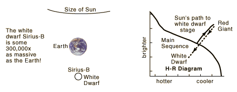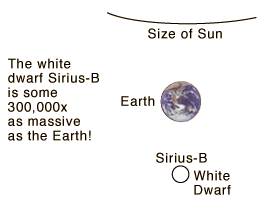White DwarfWhen the triple-alpha process in a red giant star is complete, those evolving from stars less than 4 solar masses do not have enough energy to ignite the carbon fusion process. They collapse, moving down and to the left of the main sequence until their collapse is halted by the pressure arising from electron degeneracy. An interesting example of a white dwarf is Sirius-B, shown in comparison with the Earth's size below. The sun is expected to follow the indicated pattern to the white dwarf stage. 1 teaspoon of a white dwarf would weigh 5 tons. A white dwarf with solar mass would be about the size of the Earth. ![]()