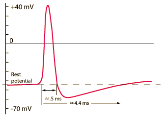 The action potential sequence is essential for neural communication. The simplest action in response to thought requires many such action potentials for its communication and performance. For modeling the action potential for a human nerve cell, a nominal rest potential of -70 mV will be used. The process involves several steps: