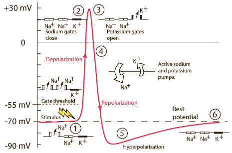 - After hyperpolarization, the Na+/K+ pump eventually brings the membrane back to its resting state of -70 mV .
