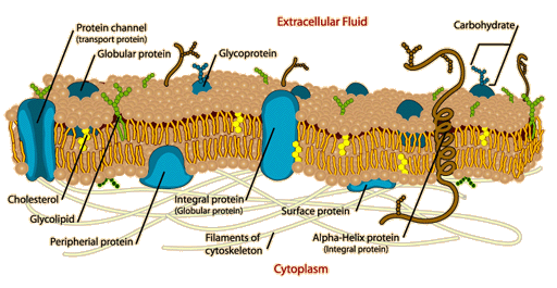 ![]() Cell membranes also contain cholesterol in the phospholipid bilayer. In some membranes there are only a few cholesterol molecules, but in others there are as many cholesterols as phospholipids according to Audesirk & Audesirk. Cholesterol makes the bilayer stronger, more flexible but less fluid, and less permeable to water-soluble substances such as ions and monosaccharides. The above illustration of a cell membrane was modified from Wikipedia. It shows that the cell membrane contains much more than just the phospholipid bi-layer.