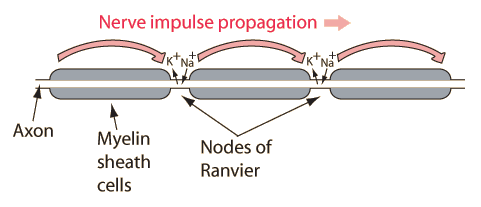 Transmission of a nerve impulse along an axonA nerve cell is like a receiver, transmitter and transmission line with the task of passing a signal along from its dendrites to the axon terminal bundle. The stimulus triggers an action potential in the cell membrane of the nerve cell, and that action potential provides the stimulus for a neighboring segment of the cell membrane. When the propagating action potential reaches the axon, it proceeds down that "transmission line" by successive excitation of segments of the axon membrane. Just the successive stimulation of action potentials would result in slow signal transmission down the axon. The propagation speed is considerably increased by the action of the myelin sheath. ![]() The myelin sheath around the axon prevents the gates on that part of the axon from opening and exchanging their ions with the outside environment. There are gaps between the myelin sheath cells known as the Nodes of Ranvier. At those uncovered areas of the axon membrane, the ion exchange necessary for the production of an action potential can take place. The action potential at one node is sufficient to excite a response at the next node, so the nerve signal can propagate faster by these discrete jumps than by the continuous propagation of depolarization/repolarization along the membrane. This enhanced signal transmission is called saltatory conduction (from the Latin saltare, to jump or hop). Tuzynski and Dixon offer some quantification of the sizes involved in these nerve cells. The axon is made up of connected segments of length about 2 mm and diameter typically 20 mm. This diameter compares to about 100 mm for the diameter of a human hair. Axon diameters may vary from 0.1 mm to 20 mm and may be up to a meter long. The much-studied squid has a giant axon of about a millimeter in diameter. The myelin sheaths are about 1mm in length. The action potential travels along the axon at speeds from 1 to 100 m/s. Contributing author: Ka Xiong Charand |