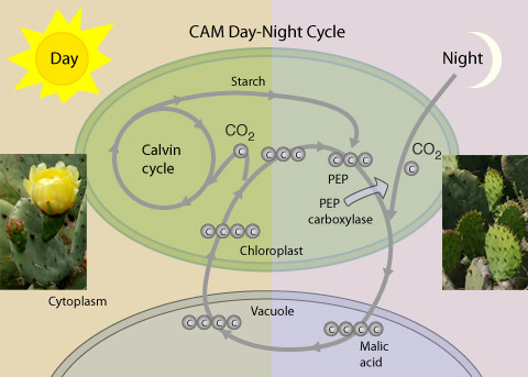The acidity was found to arise from the opening of their stomata at night to take in CO2 and fix it into malic acid for storage in the large vacuoles of their photosynthetic cells. It could drop the pH to 4 with a malic acid concentration up to 0.3M . Then in the heat of the day, the stomata close tightly to conserve water and the malic acid is decarboxylated to release the CO2 for fixing by the Calvin cycle. PEP is used for the initial short-term carbon fixation as in the C4 plants, but the entire chain of reactions occurs in the same cell rather than handing off to a separate cell as with the C4 plants. In the CAM strategy, the processes are separated temporally, the initial CO2 fixation at night, and the malic acid to Calvin cycle part taking place during the day.