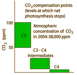 These intermediates are characterized by their resistance to photorespiration so that they can operate in higher temperatures and dryer environments than C3 plants. At right, the ranges of CO2 compensation points for the three types of plants are shown. These compensation points are the values at which the plants cease to provide net photosynthesis.