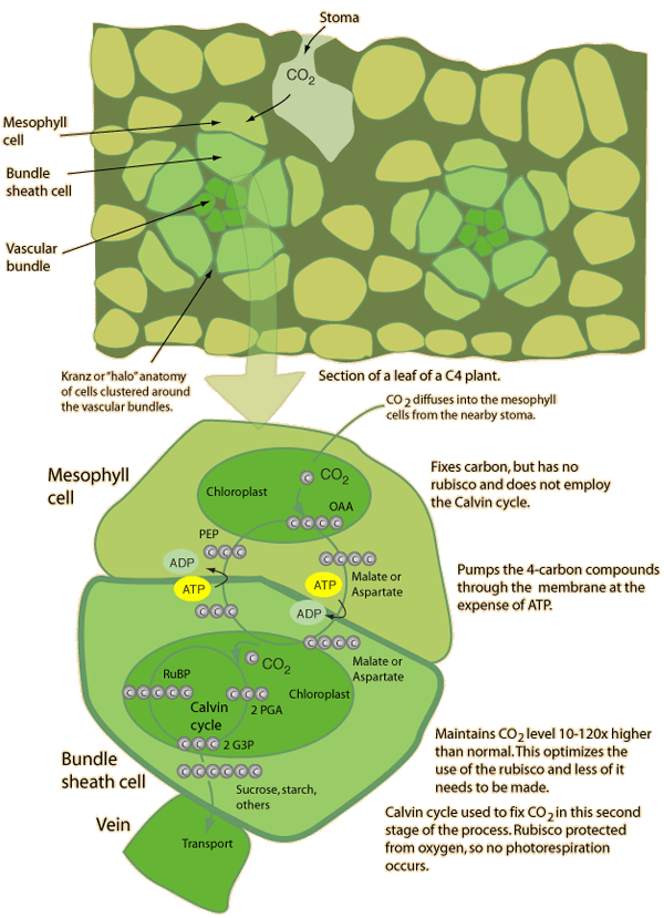The advantage that comes from this two-stage process is that the active pumping of carbon into the bundle sheath cell and the blocking of oxygen produce an environment with 10-120x as much CO2 available to the Calvin cycle and the rubisco tends to be optimally utilized. The high CO2 concentration and the absence of oxygen implies that the system never experiences the detractive effects of photorespiration.