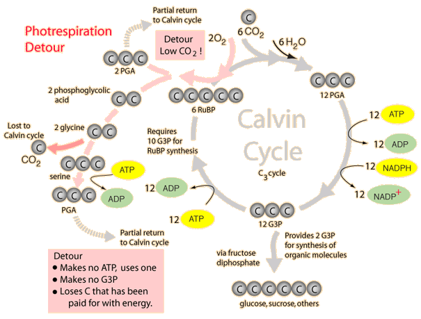 Respiration refers to the metabolism of oxygen and the release of carbon dioxide. In cellular respiration it is a positive term, a process vital to life. But photorespiration is an entirely negative term because it represents a severe loss to the process of using light energy in photosynthetic organisms to fix carbon for subsequent carbohydrate synthesis. By leading to the loss of up to half of the carbon that has been fixed at the expense of light energy, photorespiration undoes the work of photosynthesis.