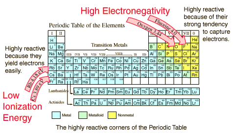 Electronegativity is a measure of the ability of an atom in a molecule to draw bonding electrons to itself. The most commonly used scale of electronegativity is that developed by Linus Pauling in which the value 4.0 is assigned to fluorine, the most electronegative element. Lithium, at the other end of the same period on the periodic table, is assigned a value of 1. Electronegativity generally increases from left to right on the periodic table and decreases from top to bottom. Metals are the least electronegative of the elements. The Pauling electronegativities for the elements are often included as a part of the chart of the elements.