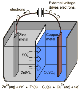 If a voltage greater than 1.10 volts is applied as illustrated to a cell under standard conditions, then the reaction