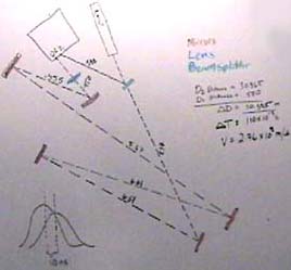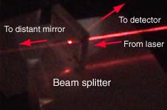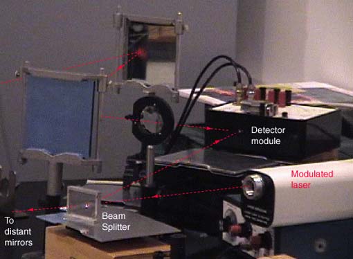 | A beam splitter is used to divide the beam for detection at begining and end of the measured path. Plane, front-surfaced mirrors are used to deflect the beam to get as long a path as possible.