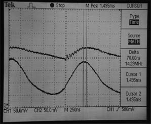 The time interval measured on the oscilloscope display above is 70 nanoseconds. For the longer path illustrated in the sketch above, the measured time interval was 110 ns and corresponded to a light speed of 2.76 x 10^8 m/s.