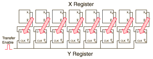 Parallel Data TransferThe illustration below shows the parallel transfer of 8 bits of data from the X Register to the Y Register upon application of an enabling transfer pulse. Clearly, parallel data transfer is faster than serial data transfer, but serial transfer has the advantages of requiring less hardware. These registers are made up of D flip-flops, which can serve as memory locations. The information in the X Register is intact after the transfer to the Y Register, so this process shows a possible scenario for accessing digital information stored in memory. ![]() |