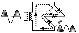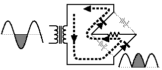 For both positive and negative swings of the transformer, there is a forward path through the diode bridge. Both conduction paths cause current to flow in the same direction through the load resistor, accomplishing full-wave rectification.