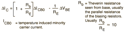 An increase in temperature produces an increase in the minority carrier current, but a negative change in VBE, so both effects lead to an increase in collector current with temperature. Since the emitter resistance shows up in the denominator of both terms, this shows that a large value of RE is desirable for temperature stability.