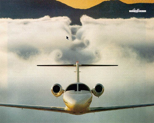 This photo is posted on the excellent NASA educational web site dealing with aerodynamics. The photo is credited to Paul Bowens and was supplied by Jan-Olov Newborg, of Stockholm, Sweden. The Cessna Citation has just flown above a cloud deck, and the downwash from the wing has pushed a trough into the cloud deck. Note the swirling flow from the tip vortices.