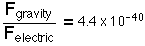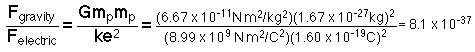 Since the masses and charges of basic particles like the electron and proton are independent of each other, the strength of the gravity force relative to the electromagnetic force depends upon which particles you choose for comparison. If two protons are chosen for the comparison, then .Using the electromagnetic coupling constant of 1/137 then leads to a gravitational coupling constant .If the force between an electron and a proton is used, the comparison between gravitational and electric force is .