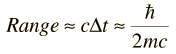 Range of ForcesIf a force involves the exchange of a particle, that particle has to "get back home before it is missed" in the sense that it must fit within the constraints of the uncertainty principle. A particle of mass m and rest energy E=mc2 can be exchanged if it does not go outside the bounds of the uncertainty principle in the form ![]() A particle which can exist only within the constraints of the uncertainty principle is called a "virtual particle", and the time in the expression above represents the maximum lifetime of the virtual exchange particle. Since this exchange particle cannot exceed the speed limit of the universe, it cannot travel further than c times that lifetime. The maximum range of the force would then be on the order of ![]() Calculation |