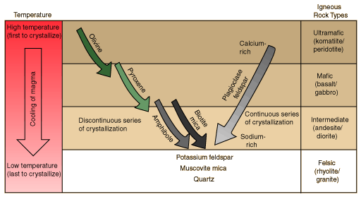 In the early part of the 20th century, N. L. Bowen carried out experiments to characterize the process of crystallization of igneous rocks from magma. The illustration below is patterned after Lutgens and Tarbuck's perspective of that reaction series.