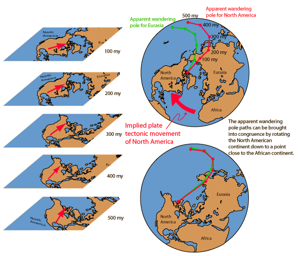 The magnetic field at any point on the Earth would orient a compass in the direction of magnetic North. The compass needle is a mobile magnet that rotates to align with the magntic field. Measurement of the magnetic field direction at a point on the Earth could tell you where the magnetic North pole is at that time, but you would have to measure the dip angle as well as the direction parallel to the surface to imply the pole location. The illustration below follows the treatment of Lutgens and Tarbuck who trace the evidence for plate tectonics that comes from the study of the magnetization of minerals. Studies of lava flows in Europe during the 1950s and later in North America showed a change in the orientation of the magnetic field with the age of the lava. This was taken as evidence that the magnetic poles "wandered" over the surface of the Earth. But given the stability of the Earth's rotation axis and it's association with the magnetic field generation as discussed above, it seems more likely that the land mass itself had "wandered", i.e., undergone plate tectonic movement. A problem arose with the comparison of the Eurasian and North American studies, since they showed different paths for the "pole wandering". But it was found that if you migrated the North American continent over toward the African continent, the curves came into congruence. The "problem" of different pole wandering paths became powerful evidence that the continents themselves had changed their relative positions in comparison to a presumably almost stationary magnetic pole. ![]()