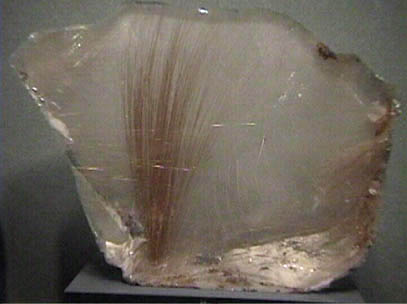 | This sample of rutile is on display at the Smithsonian Museum of Natural History. Rutile is titanium dioxide, TiO2, and it appears as fine red crystals within the larger clear quartz mineral. The size of the sample is about 15-20 cm high.