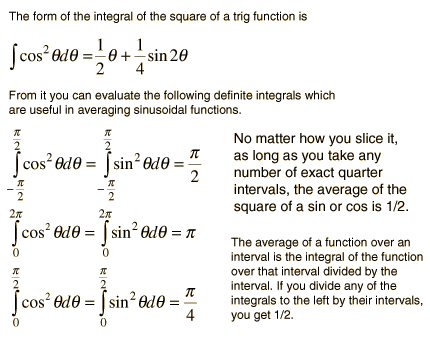 Definite Integrals of the Squares of Trig FunctionsIn dealing with sinusoidal functions associated with waves and those associated with AC electric circuits, the squares of trig functions appear. If they are averaged, then the average of the square of a trig function is found to be 1/2, so long as you are taking an integer number of quarter periods. ![]()