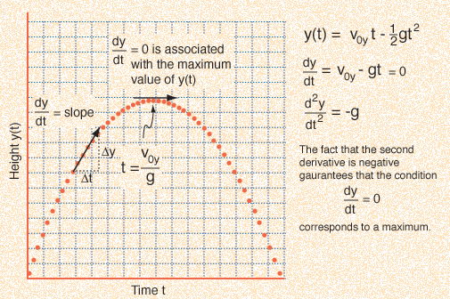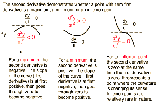 The derivative of a function can be geometrically interpreted as the slope of the curve of the mathematical function y(t) plotted as a function of t. The derivative is positive when a function is increasing toward a maximum, zero (horizontal) at the maximum, and negative just after the maximum. The second derivative is the rate of change of the derivative, and it is negative for the process described above since the first derivative (slope) is always getting smaller. The second derivative is always negative for a "hump" in the function, corresponding to a maximum