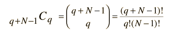 Now this can be seen as a distribution of two types of items, energy units and state boundaries. There would always be q units of energy and N-1 state boundaries for a total of q + N - 1 symbols. So the number of ways to distribute q units of energy would just be the combination