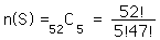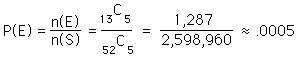 Basic ProbabilityThe probability for a given event can be thought of as the ratio of the number of ways that event can happen divided by the number of ways that any possible outcome could happen. The concept of probability is one of the foundations of general statistics. The likelihood of a particular outcome among the set of possible outcomes is expressed by a number from 0 to 1, with 0 representing an impossible outcome and 1 representing the absolute certainty of that outcome. If we identify the set of all possible outcomes as the "sample space" and denote it by S, and label the desired event as E, then the probability for event E can be written ![]() In the probability of a throw of a pair of dice, bet on the number 7 since it is the most probable. There are six ways to throw a 7, out of 36 possible outcomes for a throw. The probability is then ![]() The idea of an "event" is a very general one. Suppose you draw five cards from a standard deck of 52 playing cards, and you want to calculate the probability that all five cards are hearts. This desired event brings in the idea of a combination. The number of ways you can pick five hearts, without regard to which hearts or which order, is given by the combination ![]() ![]() The same basic probability expression is used, but it takes the form ![]() So drawing a five-card hand of a single selected suit is a rare event with a probability of about one in 2000. If you want the probabability that any one of a number of disjoint events will occur, the probabilities of the single events can be added. For example, the probability of drawing five cards of any one suit is the sum of four equal probabilities, and four times as likely. In boolean language, if the events are related by a logical OR, then the probabilities add. The probability of 5 hearts OR 5 clubs OR 5 diamonds OR 5 spades is approximately .002 or 1 out of 500, four times the probability of drawing 5 hearts. If the events are related by a logical AND, the resultant probability is the product of the individual probabilities. If you want the probability of throwing a 7 with a pair of dice AND throwing another 7 on the second throw, then the probability would be the product ![]() A common misconception about probability is that being "lucky" once will lower the probability that you will be "lucky" again. Probability has no causative effect, so prior events have no influence on the probability for future events. For example:
