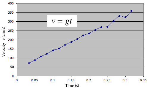 Taking differences between the measured distances in pairs and dividing by 1/60 second gives this velocity curve. It is generally a straight line as predicted by v=gt, but you can see deviations which we associated with a slight rocking motion of the bob as it falls.