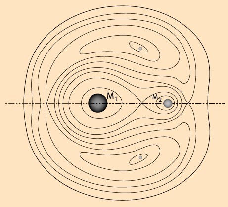One of the contributions of Lagrange was to plot contours of equal gravitational potential energy for systems where the third mass was very small compared to the other two. Below is a sketch of such equipotential contours for a system like the Earth-Moon system. The equipotential contour that makes a figure-8 around both masses is important in assessing scenarios were one partner loses mass to the other. These equipotential loops form the basis for the concept of the Roche lobe.