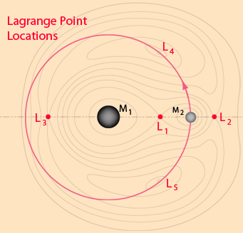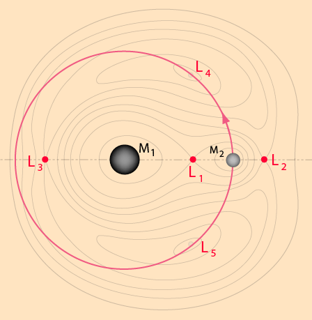 One of Lagrange's observations from the potential contours was that there were five points at which the third body could be at equilibrium, points which are now referred to as Lagrange points.