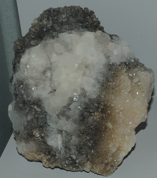 This sample of aphthitalite is displayed in the Smithsonian Museum of Natural History. Aphthitalite is a sulfate mineral of potassium and sodium with the composition (K,Na)3Na(SO4)2. The sample at left is about 12 cm across and is from Glom salt dome, Iran.