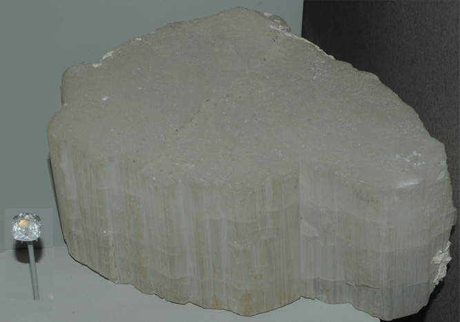 These samples of beryllonite are displayed in the Smithsonian Museum of Natural History. Beryllonite is a phosphate mineral of beryllium with the composition NaBePO4. The sample at left is about 20x5 cm across and is from Poprok, Kunar, Nuristan, Afghanistan. The gem is to the same scale and is 5 carats.