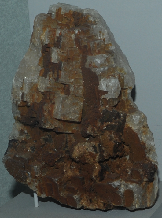 This sample of cryolite is displayed in the Smithsonian Museum of Natural History. Cryolite is a fluoride of sodium and aluminum with the composition Na3AlF6. The sample at left is about 15 cm across and is from Ivigtut, Greenland. This sample is described as cryolite with siderite.