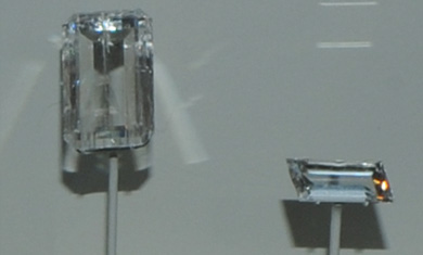 These samples of hambergite are displayed in the Smithsonian Museum of Natural History. Hambergite is a oxide mineral of beryllium and boron with the composition Be2BO3(OH). The sample at left is about 3 x 5 cm and is from Imalo, Madagascar.