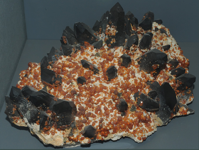 This sample containing helvite is displayed in the Smithsonian Museum of Natural History. The sample is described as spessartine with helvite, quartz, and microcline. Helvite is a silicate mineral of beryllium, sulfur and manganese with the composition Mn4Be3(S(SiO4)3). The sample at left is about 20 cm long and is from Tongbei, Fujian Province, China. The black crystals are taken to be spessartine, the orange helvite, and the tan microcline.